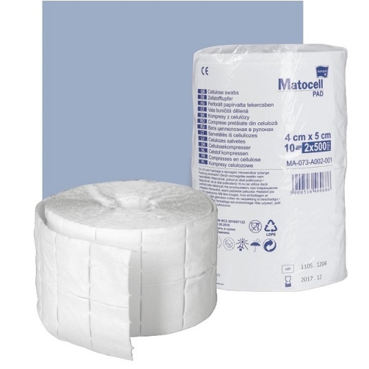 Marca: MATOPAT Tampoane celuloză simple, MATOPATdezinfectare piele înainte de injecţii Material: 10 straturi celuloză Dimensiuni: 4 x 5 cm Ambalare: 2 x 500 buc / rolă cu perforaţii